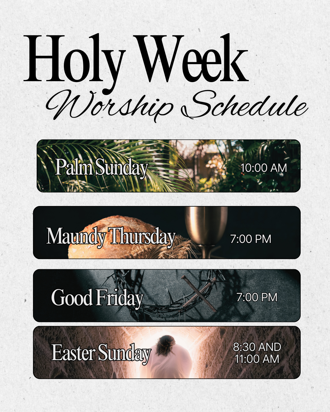 All are welcome to join our Holy Week Worship Services. Come along with us as we recognize Christ journey to the cross and celebrate his